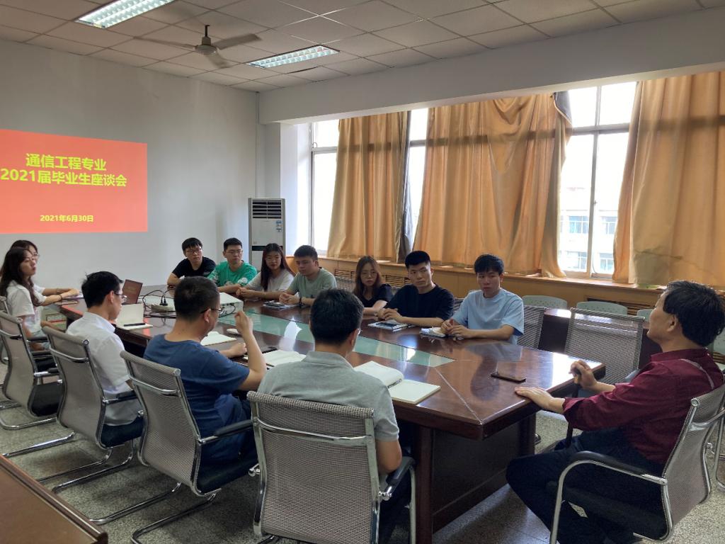 2021年6月30日下午4时,足球赌注网站通信工程系在教5-709召开2021届毕业生座谈会活动。座谈会针对通信工程专业17级本科毕业生对专业培养过程、日常管理及就业服务等环节进行座谈,收集员工的反馈意见,用于改进日后的教学工作。通信工程专业2021届9名毕业生代表、专业负责人柯熙政、通信工程系班子成员、党支部支委以及毕业生班级导师参加了座谈会。会议由支部书记兼副系主任吴鹏飞老师主持。