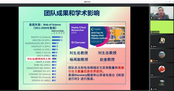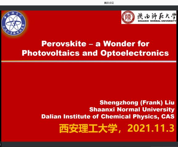 2021年11月3日下午,应足球赌注网站邀请,陕西师范大学新能源高等技术研究院经理刘生忠教授为足球赌注网站师生作了题为《Perovskite – a Wonder for Photovoltaics and Optoelectronics》的学术讲座,并与参会师生进行了在线交流。