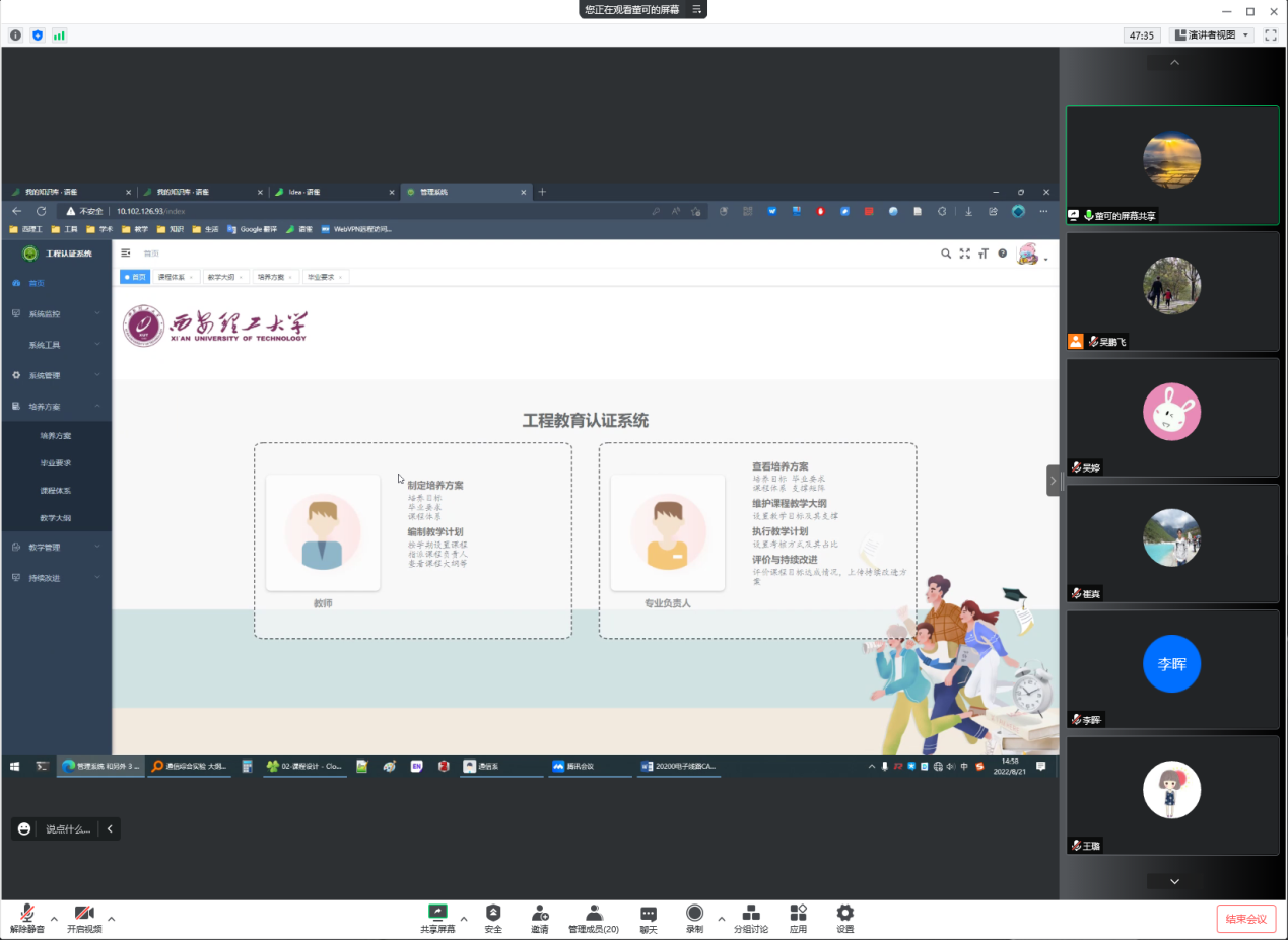 会上,系班子成员首先就公司工作布置会上安排的自己分管工作向全系老师进行了传达。教学系主任吴婷老师就20级本科生培养计划结合工程教育专业认证工作所做的微调整进行了说明;教学秘书董可老师就新开发的工程教育专业认证系统的使用方法及注意事项进行了介绍;系主任吴鹏飞老师就工程教育专业认证教学资料的整理情况,和与会每一位老师逐个进行对照讨论,提出存在问题的解决方法,要求赶八月底之前所有和工程教育专业认证有关的教学资料都要归档。系党支部书记杨玉峰就如何在疫情防控和工程教育专业认证工作中发挥党员教师的模范带头作用提出了两点要求,一是要求大家坚决落实公司和属地的疫情防控政策,积极参与疫情防控志愿者服务活动,二是要求每一位教师都要以工程教育专业认证工作为重心,把责任落实到人,高质量的完成工程教育专业认证的准备工作。