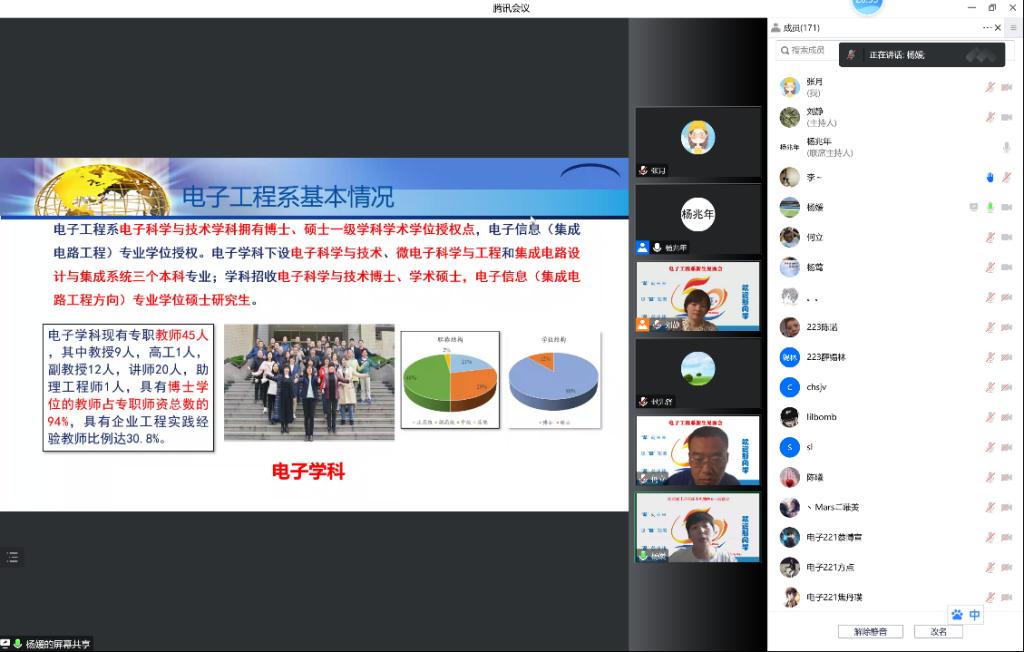 2022年9月16日下午,电子工程系在线举行了2022级新生见面会暨专业教育会。电子科学与技术学科带头人杨媛,足球赌注网站副经理封先锋,电子工程系领导班子、电子系教工党支部班子、学科全体教授、2022级本科班级导师参加了此次会议,会议由电子工程系主任刘静主持。