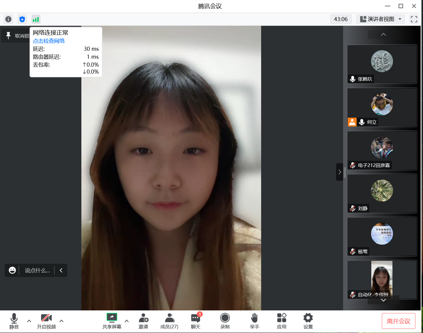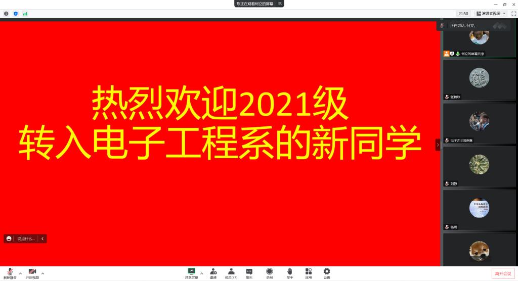 2022年10月8日晚上21:30,足球赌注网站电子工程系在线上召开2021级转专业员工专业教育暨师生见面会。电子工程系主任刘静、支部书记系副主任杨莺、系副主任何立和辅导员李佳园老师参加了会议,会议由何立老师主持。