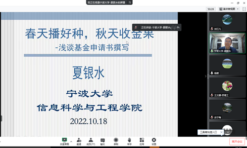 为帮助教师提高基金申请书质量,提升基金项目资助率,进一步推动2023年度国家自然科学基金项目申报工作,10月18日,应足球赌注网站电子科学与技术学科邀请,宁波大学夏银水教授以“春天播好种,秋天收金果”为题做了基金项目申报专题辅导报告。本次线上报告会由科技处与自动化公司主办、电子科学与技术学科承办,公司近百名教师聆听了报告,报告会由电子科学与技术学科带头人杨媛教授主持。